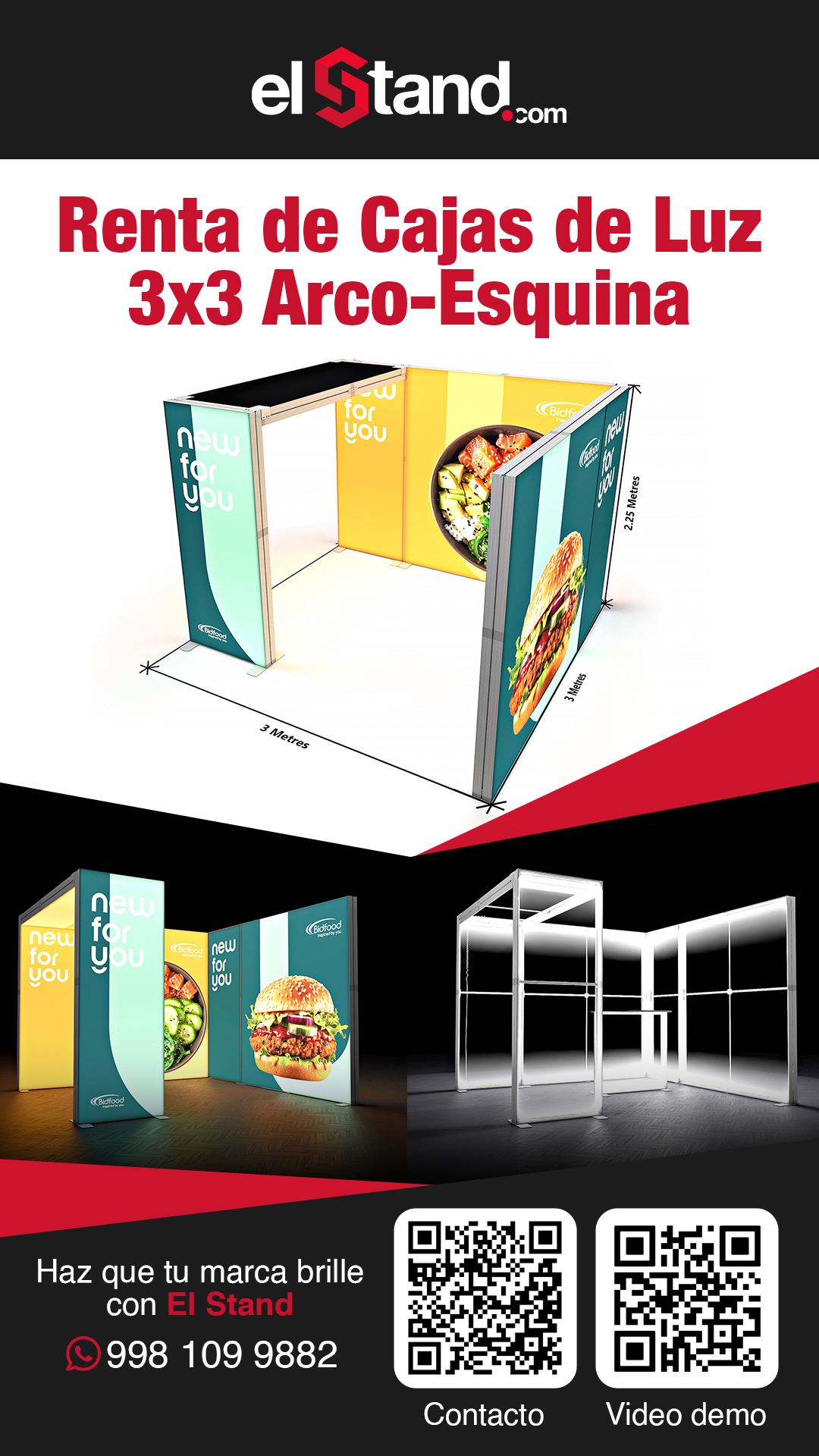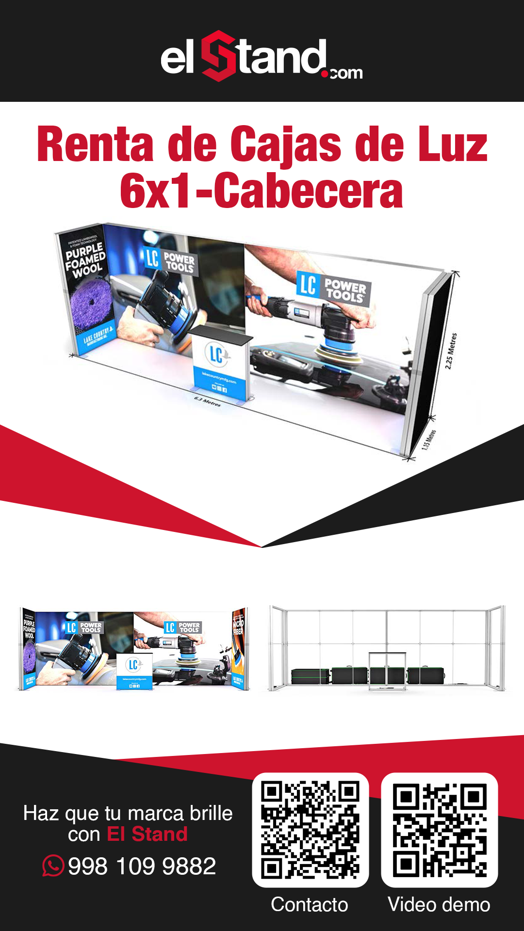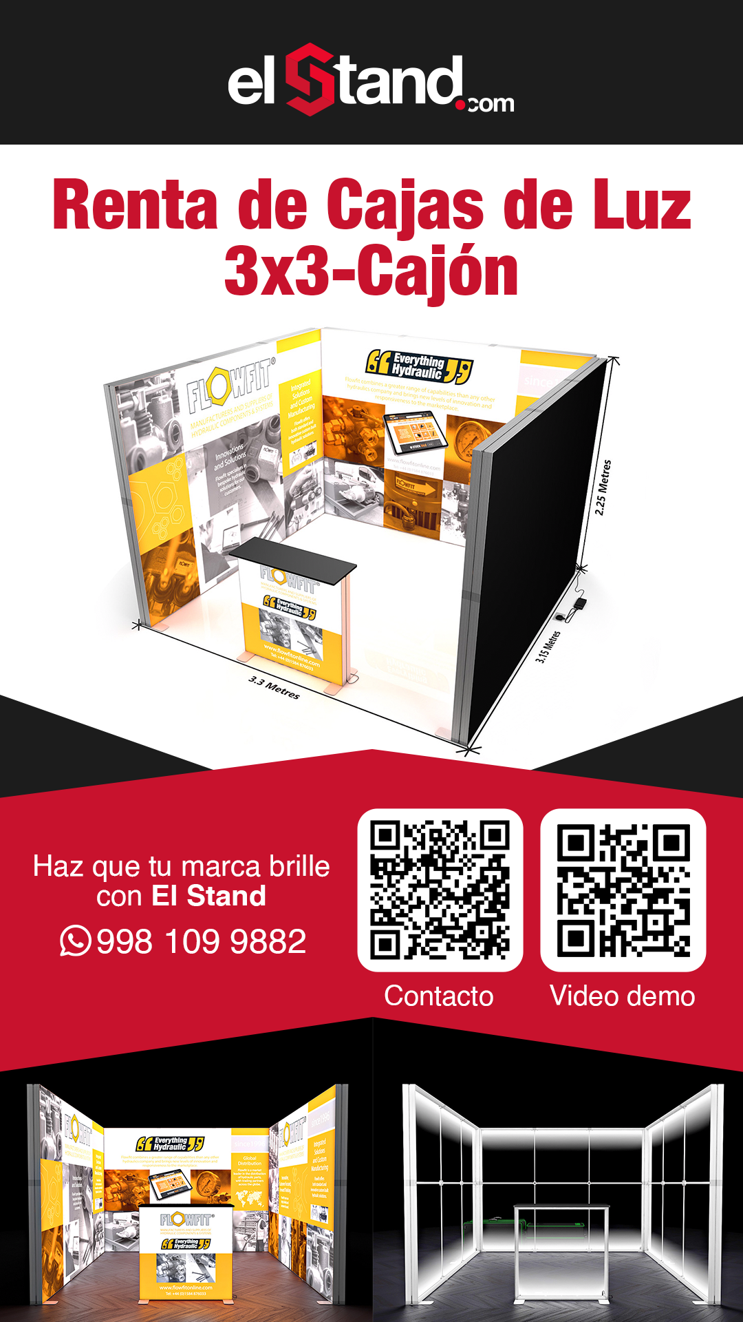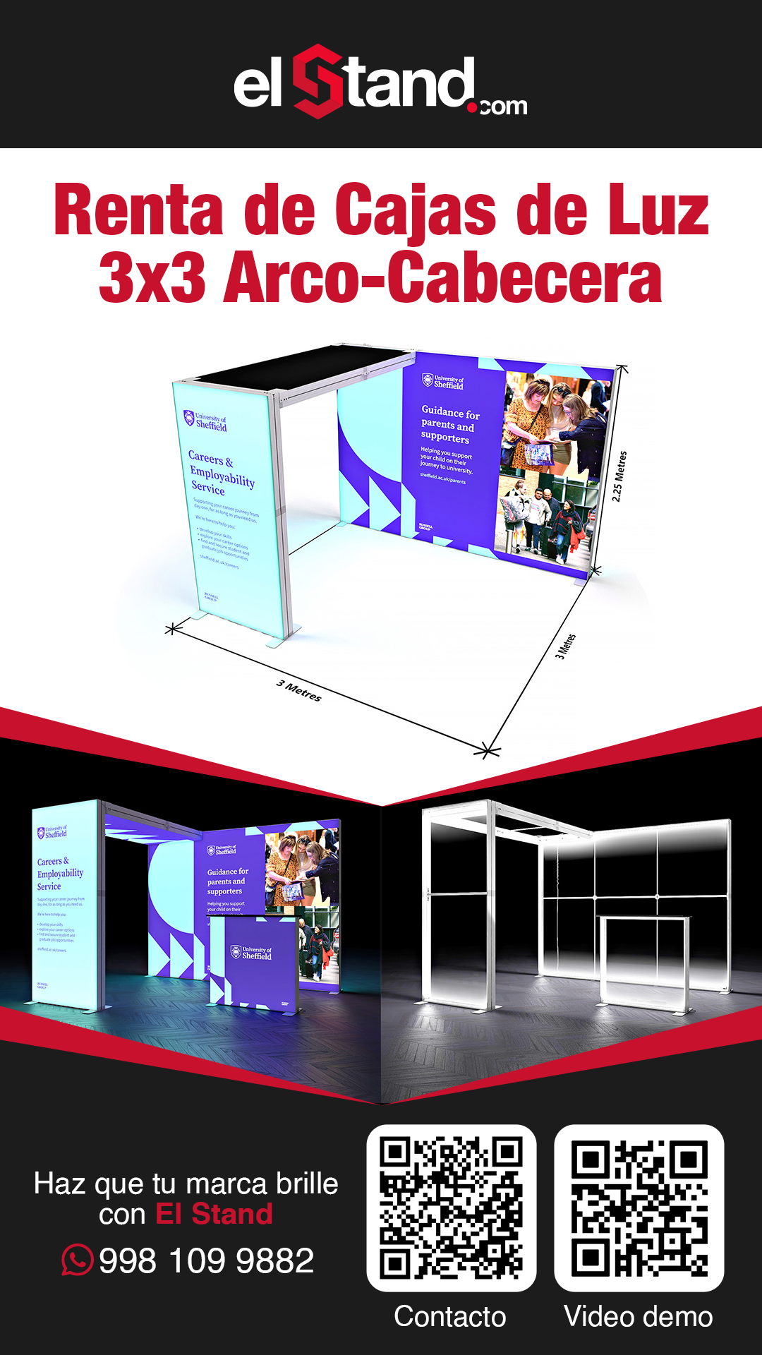 Incluye : 1 montaje, 1 Desmontaje. *Precio no incluye ningún pago por nuestra parte al recinto, se requiere contar con 1 contacto por parte del evento para electrificar las lámparas y pantallas de su stand.