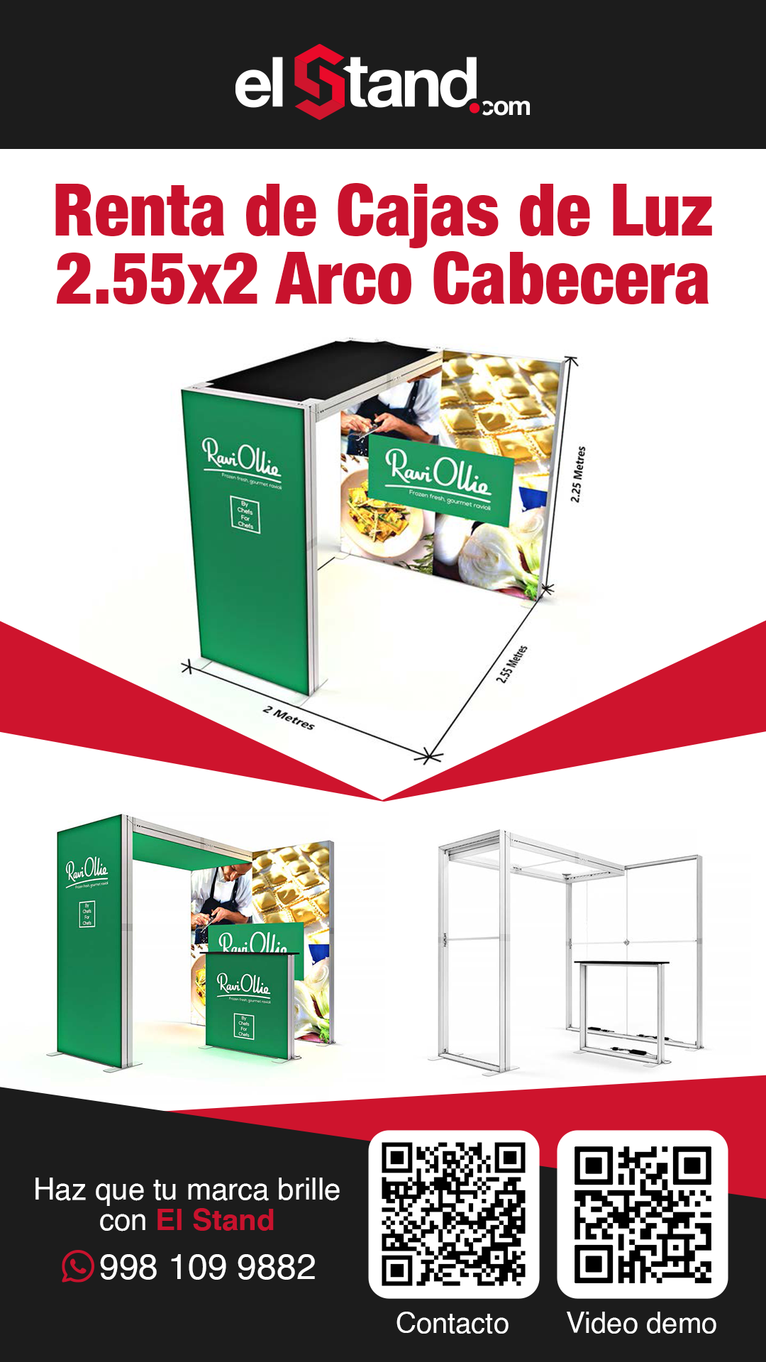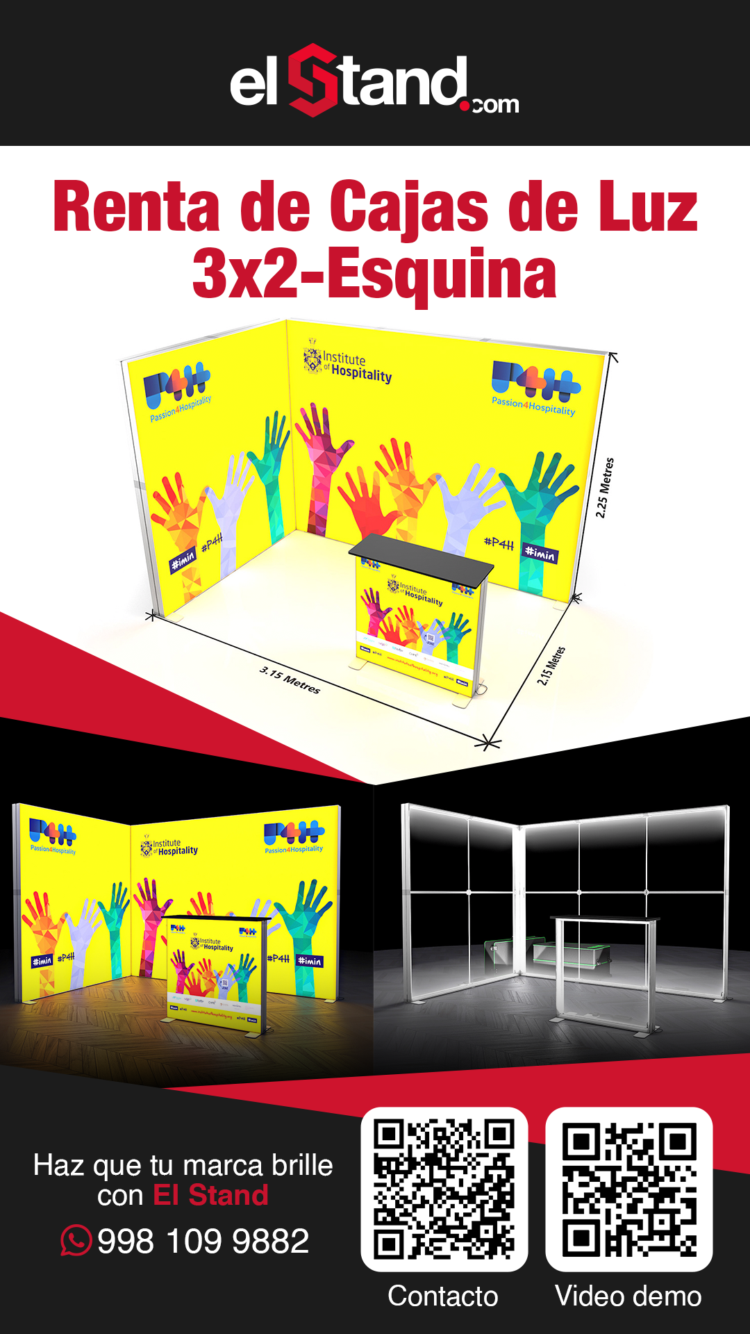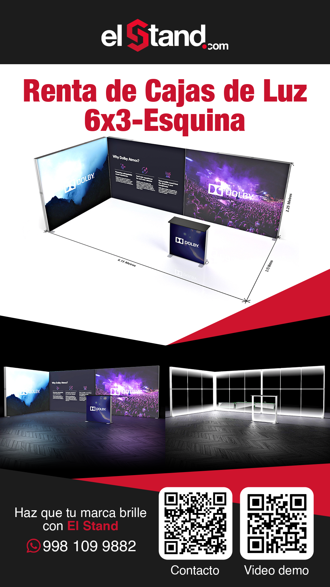 Incluye : 1 montaje, 1 Desmontaje. *Precio no incluye ningún pago por nuestra parte al recinto, se requiere contar con 1 contacto por parte del evento para electrificar las lámparas y pantallas de su stand.