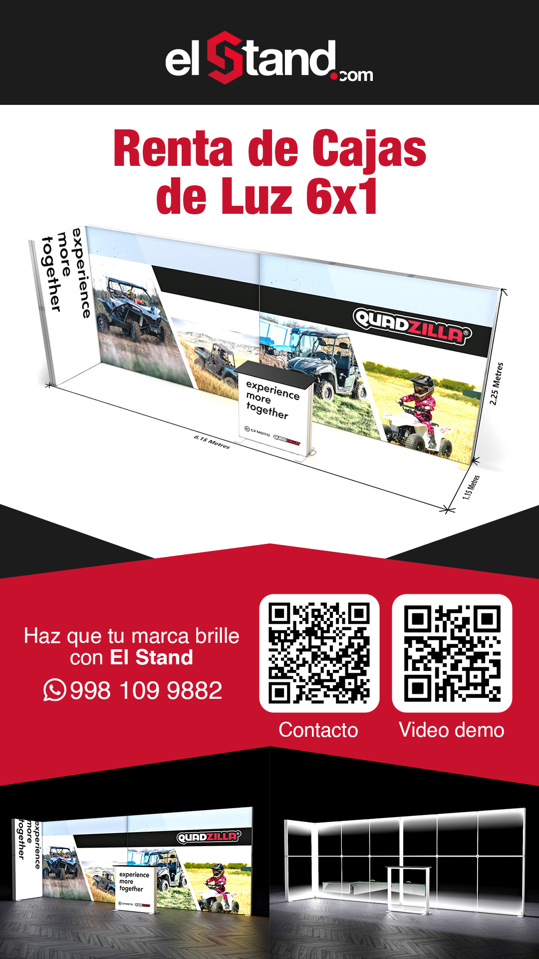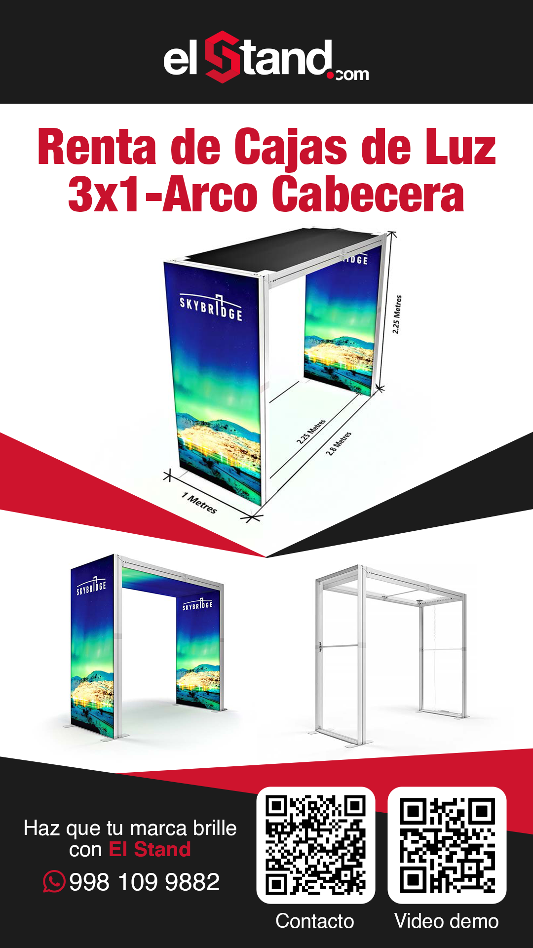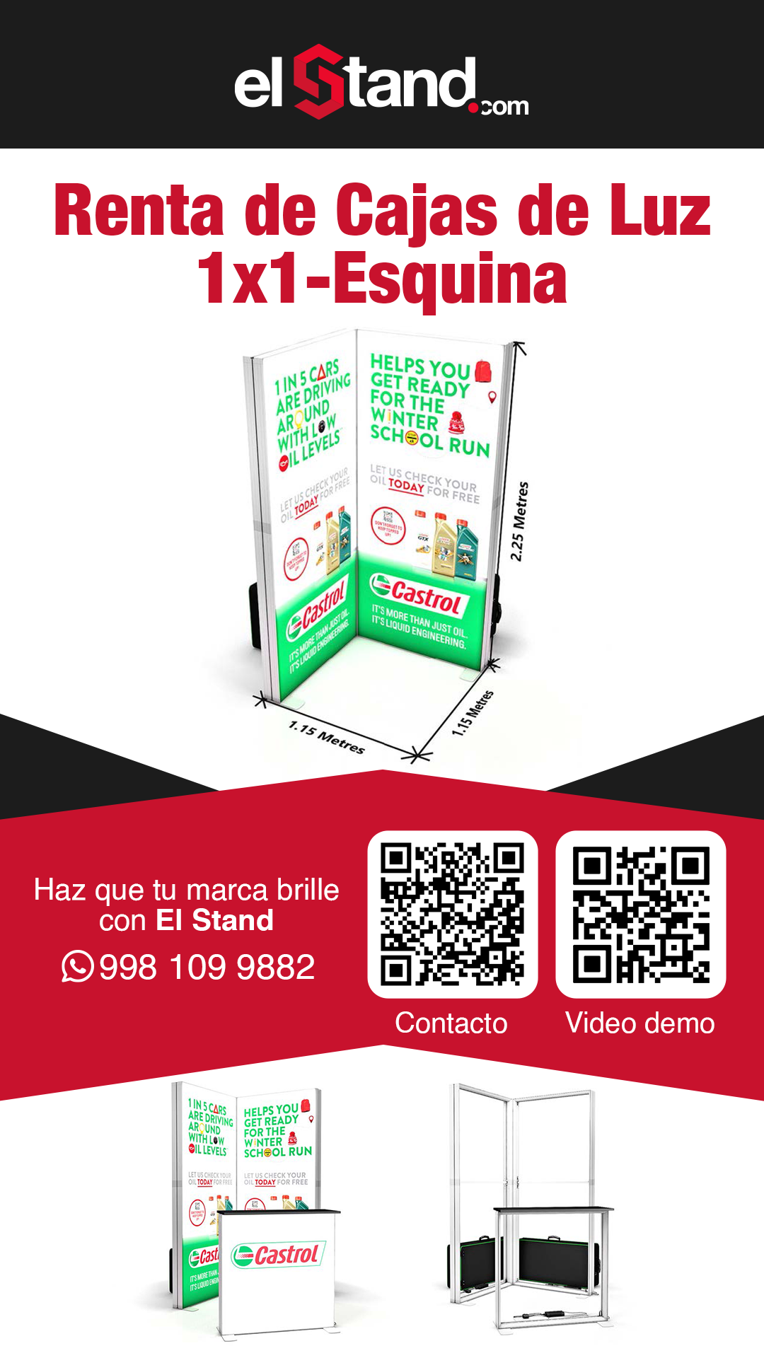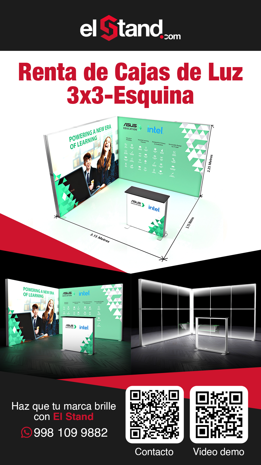 Incluye : 1 montaje, 1 Desmontaje. *Precio no incluye ningún pago por nuestra parte al recinto, se requiere contar con 1 contacto por parte del evento para electrificar las lámparas y pantallas de su stand.